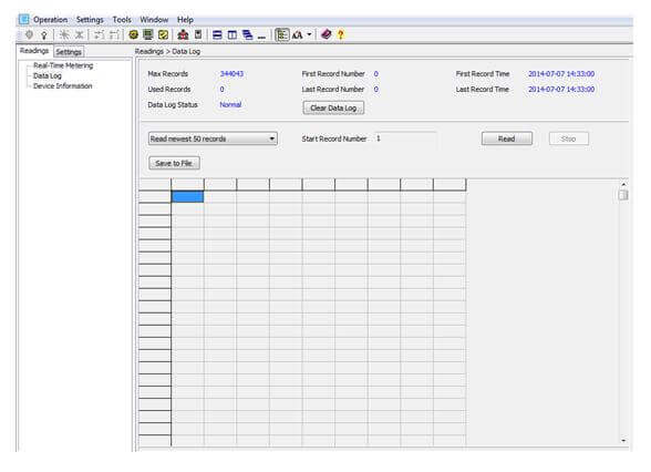 - From the left navigation panel click on the "Readings" tab, and then on "Data Log" to read and save the data logged on the meter's memory.