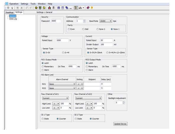 Security & Communication: You can set the meter’s password, device address, Baud Rate and parity from this section.