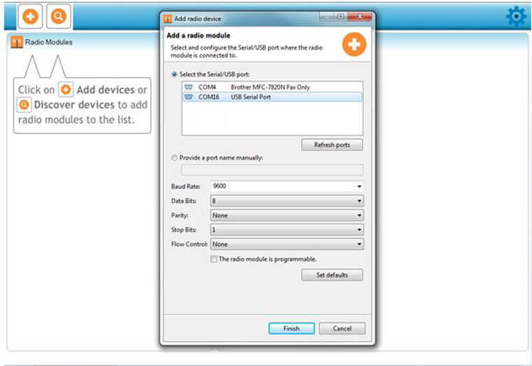 To discover other transceivers within the network press this option besides the transceiver that is connected to the computer’s USB port under the ‘Radio Modules’ view. All the remote devices that are in the same network as this transceiver that are found will appear in the pop up box. Press “Add Selected Devices”.