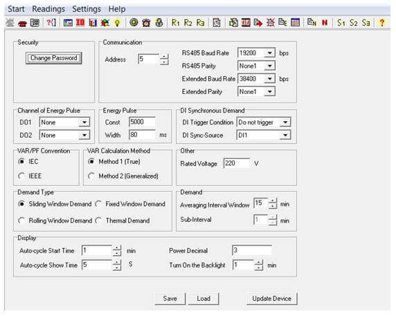 - Click on "Settings" located on the upper menu and then select "General Settings" to view and change different system settings such as meter password, communication address, baud rate, rated voltage and etc.