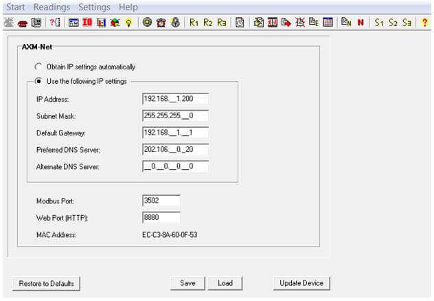 - Click on "Settings" from the upper menu and then select "Net Module Settings" to configure the Ethernet settings.