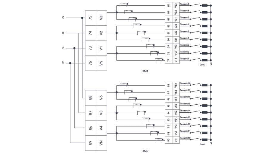 The system you are monitoring has a voltage lower than 400V LN or 690V LL and you are using the DM Module current input, the connection diagram is shown below.