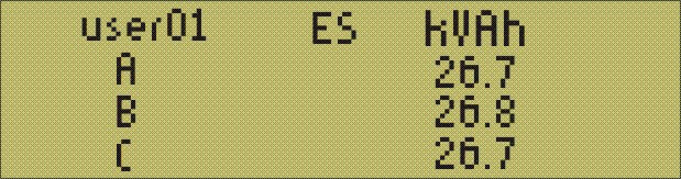 - Use the up/down arrow buttons to read different energy readings such as energy consumed (imp kWh), energy produced (exp kWh), reactive energy (kvarh) and apparent energy (kVAh) for that user.