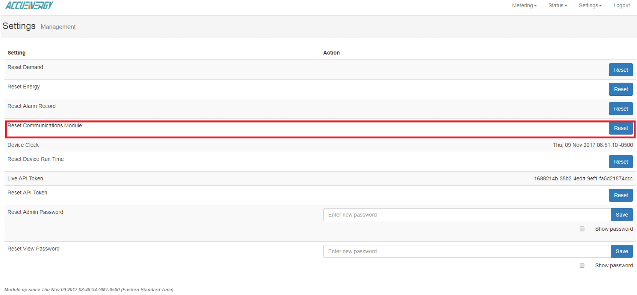 - On the 'Management' page, locate the "Reset Communications Module" option and click on 'Reset'.