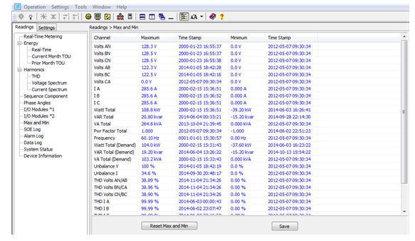 - From the left navigation panel click on the "Readings" tab, and then click on "Max and Min" to view the maximum and minimum values for different parameters.