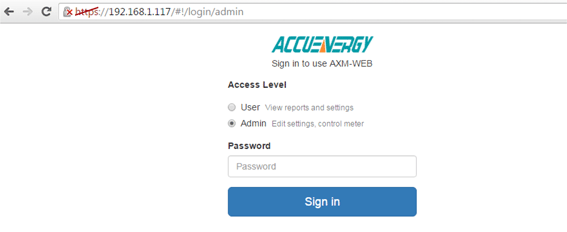 Open an internet browser and type in the IP address of the meter in the browser search bar and hit the Enter key. The meter's web login page will display as followed: