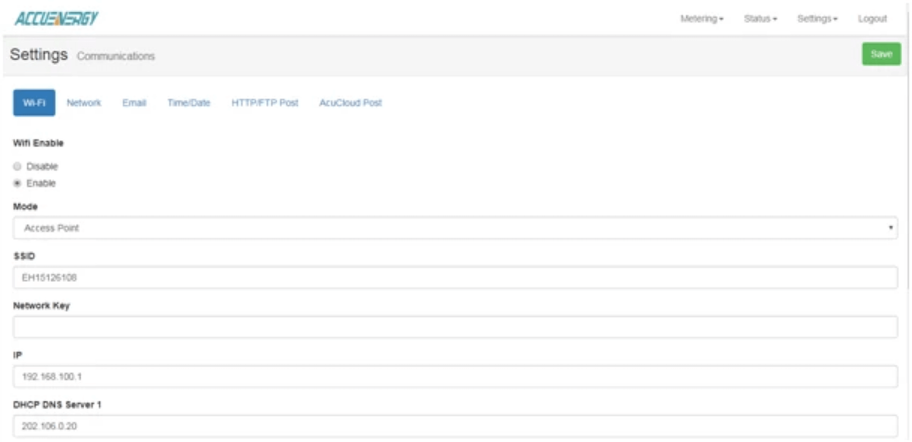 The configurations related to the AcuRev 2020 can be found from the 'WIFI' tab in the Communications page.