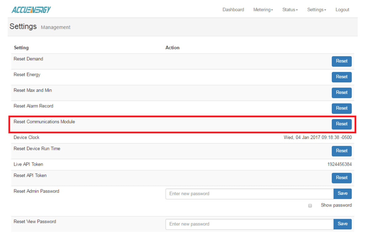 On the 'Management' page, locate the "Reset Communications Module" option and click on 'Reset'.
