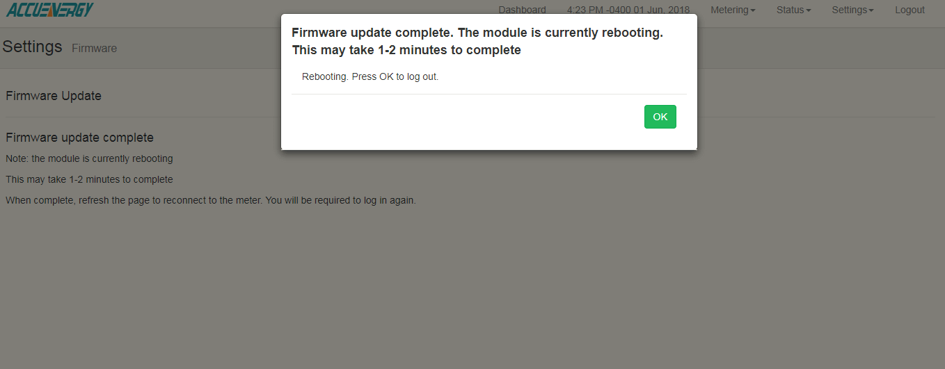 Once updated the user will be prompted that the update is complete and the module will reboot.