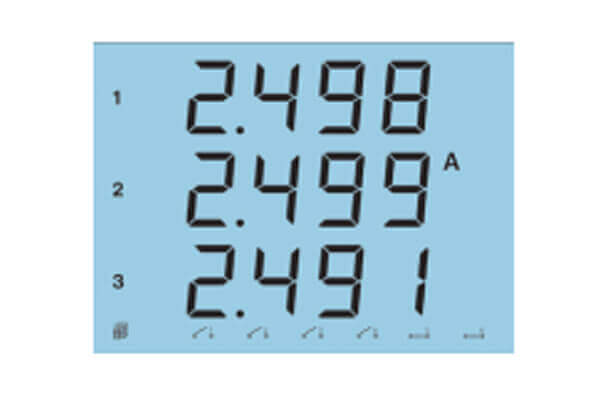 - Press ‘V/A’ to display the phase and line voltages, as well as the current readings. The last screen will display the average of the voltage and current.