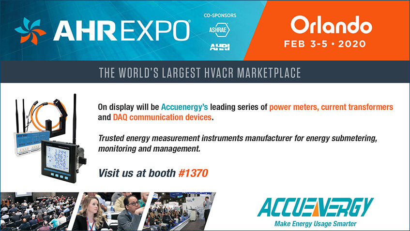 Accuenergy will be exhibiting at the AHR Expo between Feb 3-5 at booth 1370. Our product line is used by facility managers in HVACR installations to measure energy consumption for monitoring and billing of their building subsystem. Our team has industry wide experience installing and deploying energy measurement products for distribution companies, OEM, manufacturing & commercial facilities.