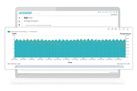 View the energy consumption for a given time frame or easily compare one time frame to another. Compare kWh consumption data against local temperature to accurately correlate energy usage and spot important trends, then export as an image for easy report creation or download as a CSV file to integrate into other datasets.