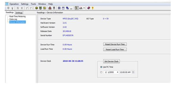 - From the left navigation panel click on the "Readings" tab and then on "Device Information" to view information such as the device type, hardware and software version of the meter, as well as the Device Clock, Load Run-Time and Device Run-Time.
