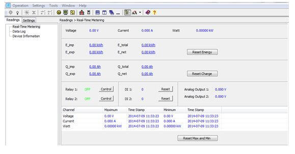 - From the left navigation panel click on the "Readings" tab and then click on "Real-Time Metering" to view real time data such as voltage, current, power, energy, electric charge etc.
