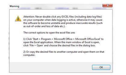 to start data logging, a warning window will pop up. Take note of the warning in order to prevent your files from being corrupt.