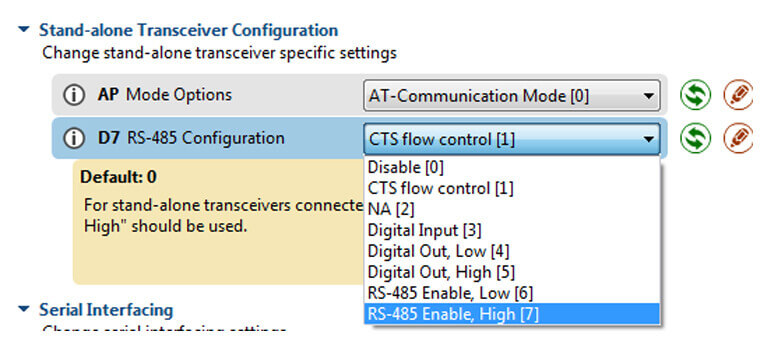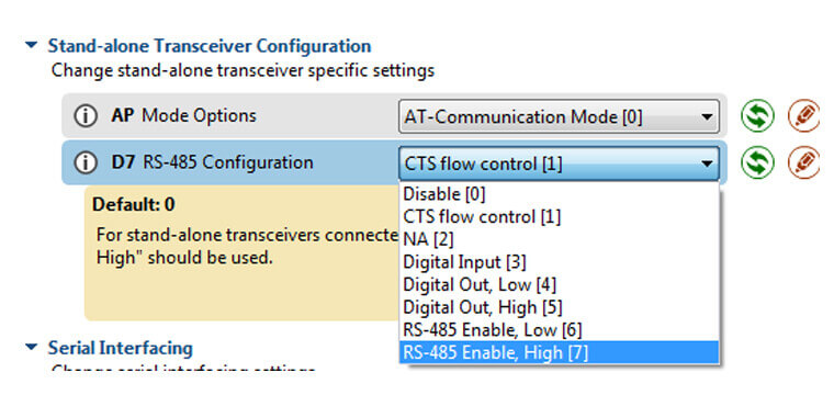 To configure the settings for the remote modules, select one remote transceiver at a time and Change the "D7 RS485 Configuration" from "CTS flow control [1]" to "RS-485 Enable, High [7]" which is under the "Stand alone Transceiver Configuration" section.
