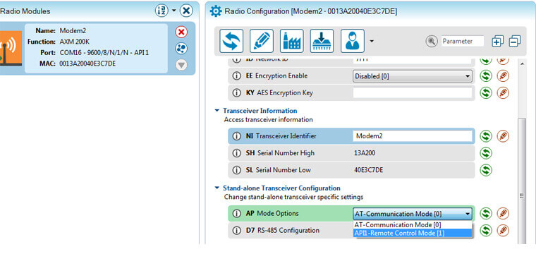 Once this setting has been changed on transceivers, click on the master transceiver (the transceiver connected to the USB of the computer) and change back the "AP Mode Options" setting to "AT-Communication Mode[0].