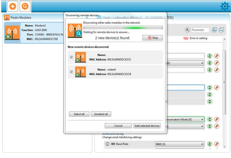 To discover other transceivers within the network press this option besides the transceiver that is connected to the computer’s USB port under the ‘Radio Modules’ view. All the remote devices that are in the same network as this transceiver that are found will appear in the pop up box. Press “Add Selected Devices”.