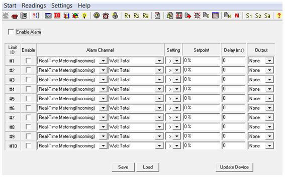 - Click on "Settings" from the upper menu and then select "Alarm settings" to configure the meter to enabled alarms.