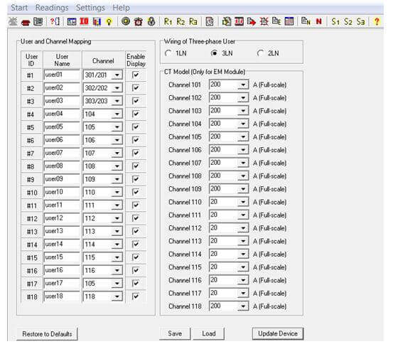 - Channels: Correspondence between the user and the current input channels of the meter. You can select "101-118" if the users are single phase or "301/201-306/206" otherwise; these numbers represent the 18 single phase channels or the 6 three phase channels.