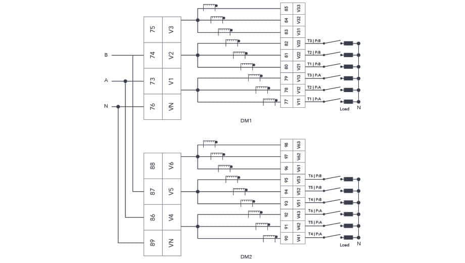 The system you are monitoring has a voltage lower than 400V LN or 690V LL and you are using the DM Module current input, the connection diagram is shown below.
