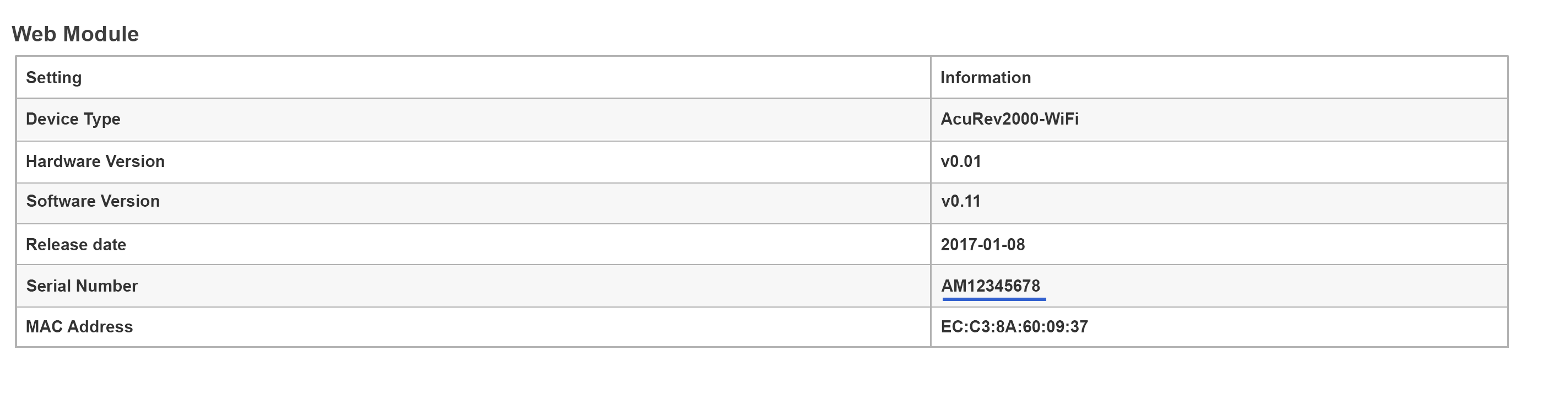 Where serialNumber is the serial number of the AcuRev 2020-WEB.