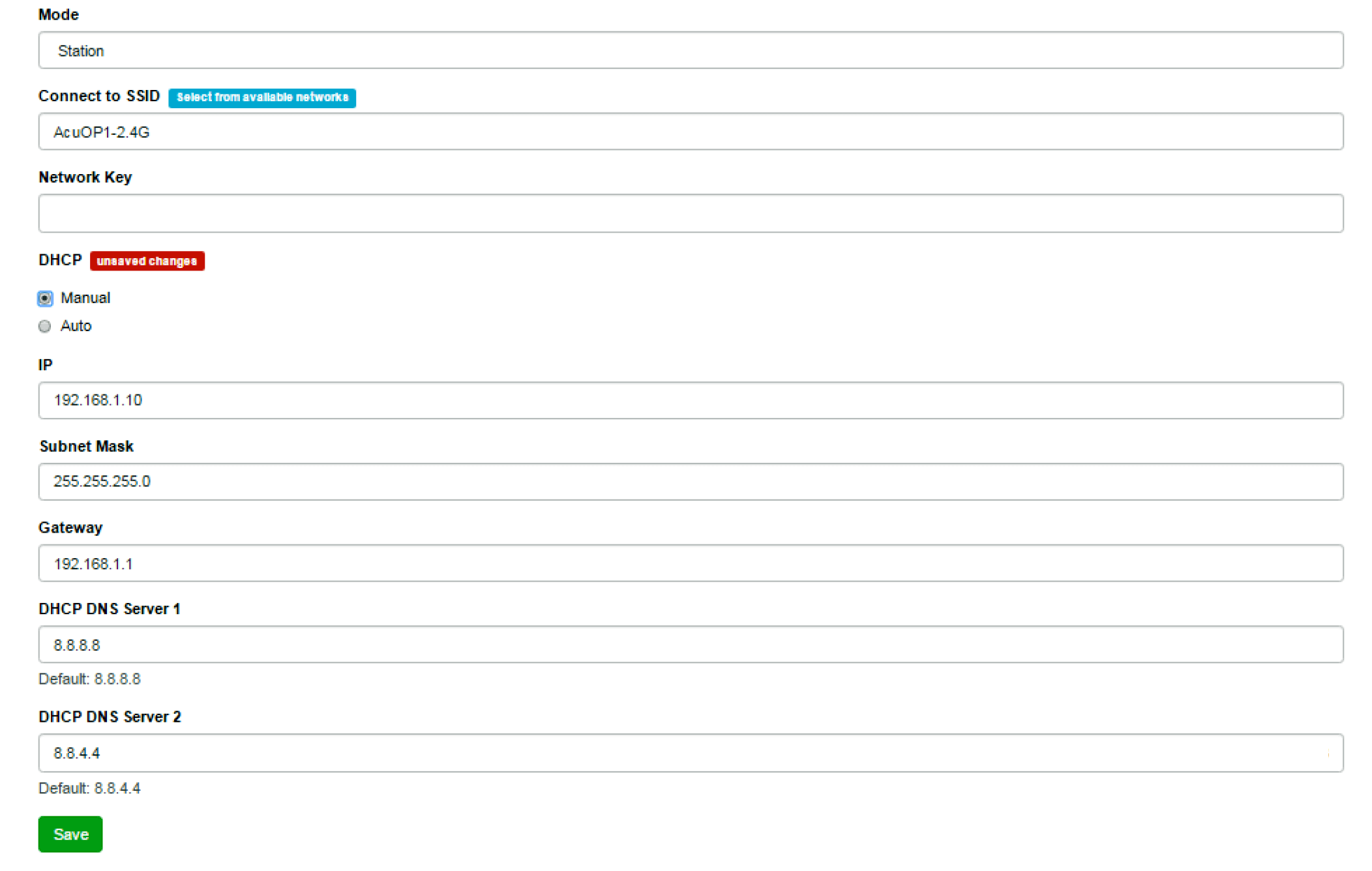 In Access Point mode, users can configure the SSID, Network Key and IP of the AcuRev 2020 module as well as the DNS servers.