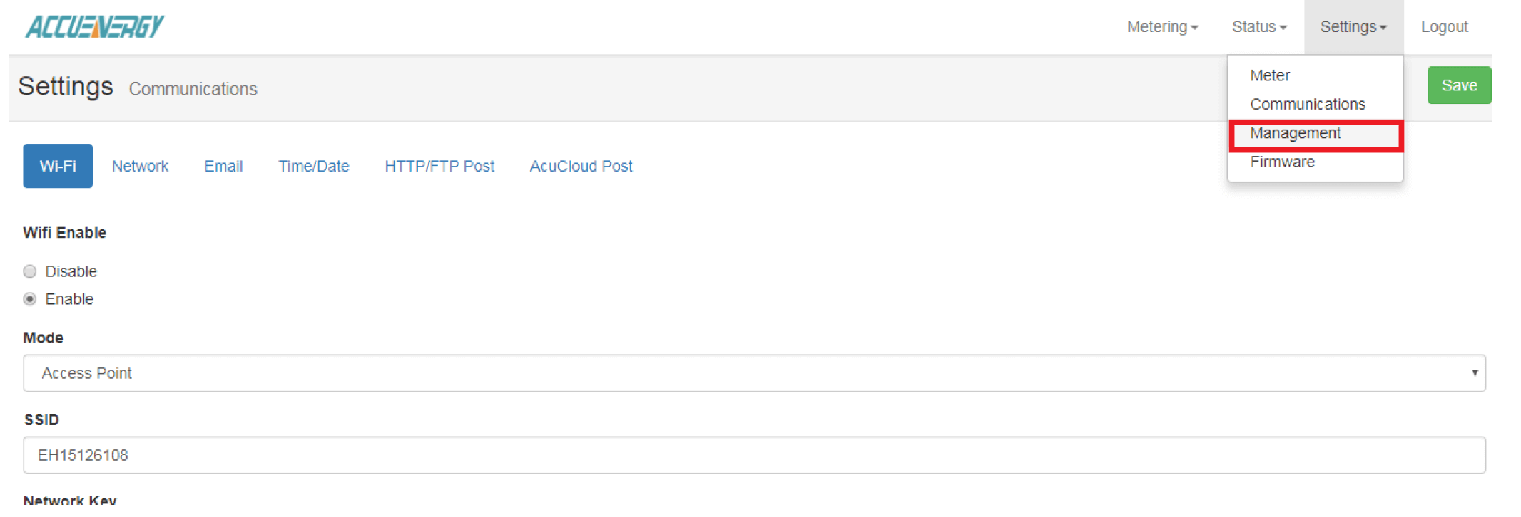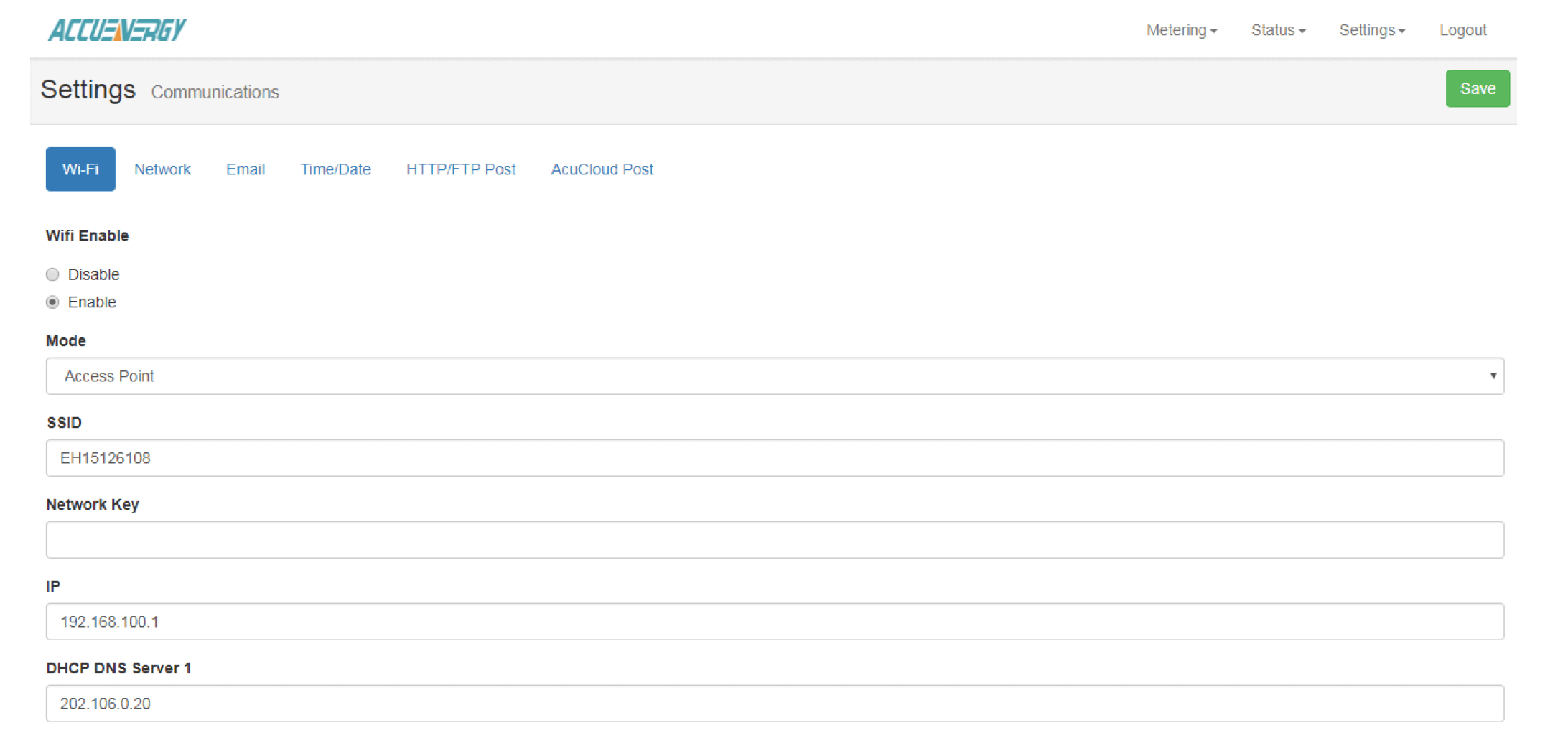 The configurations related to the AcuRev 2020 can be found from the 'WIFI' tab in the Communications page.