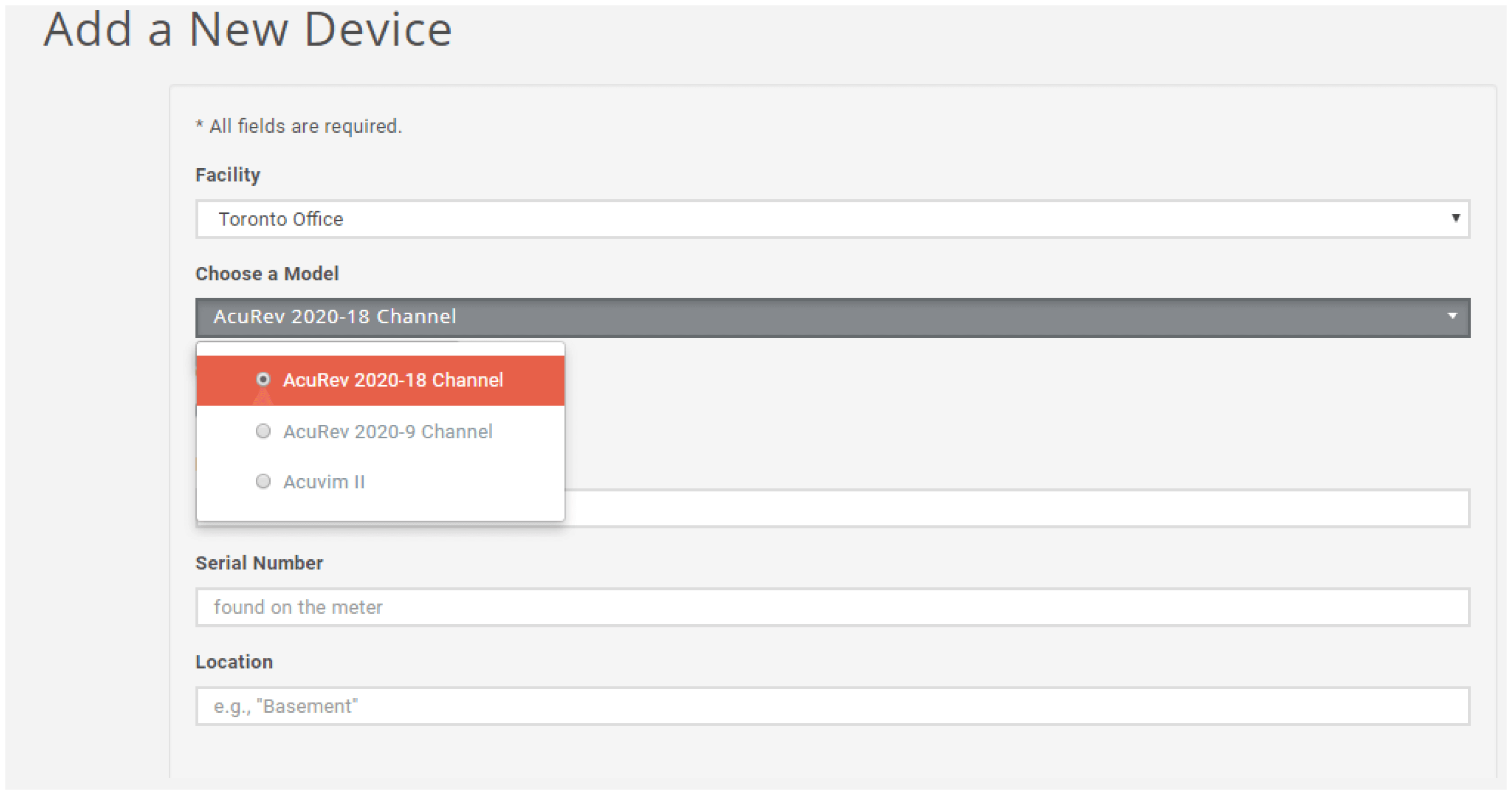 - Enter the serial number of the AcuRev meter under Serial Number(found on the AcuRev 2020 web interface in the Device Information page of the AcuRev 2020 web interface). The Serial number must be entered in Upper Case.