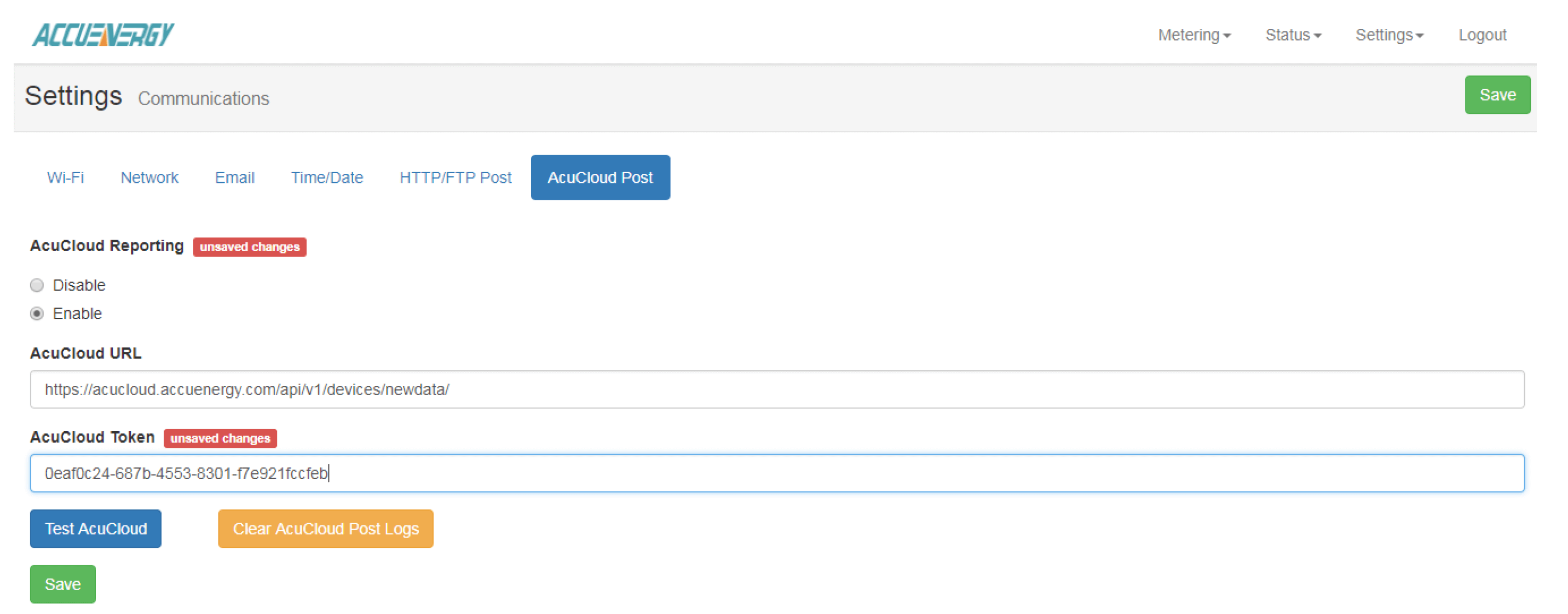 This process requires the user to first add the meter to AcuCloud and obtain a token which will act a verification when sending data from the AcuRev 2020 meter. Finally this generated token will be used to configure the meter from the AcuRev 2020 web interface