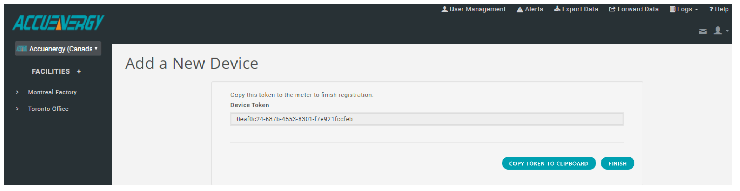 Once the device has been successfully created, a token will be returned on the ensuing page. The user will need to copy the token that is provided as it will be used in the next step to configure the meter to send its data to AcuCloud.