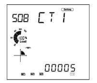 - Press "P" to get to "S08 CT1" screen. If no Current Transformers (CTs) were used, leave this as default. If CTs were used, enter in the primary value of the CT here.