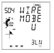 - Press "P" until you get to "S04 WIRE MODE U" screen. Select the required voltage wiring mode. This will be based on your voltage connection. E.g. if it’s a three phase 4 wire connection, select "3LN".