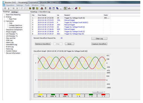 - From the left navigation panel click on the "Readings" tab, and then on "Waveform Log" to view the waveform log, as well as retrieve and save the Waveform. You can also trigger a waveform manually by clicking "Capture Waveform"