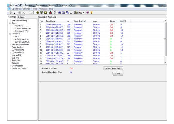 - From the left navigation panel click on the "Readings" tab, and then on "Alarm Log" to view and save the Alarm log
