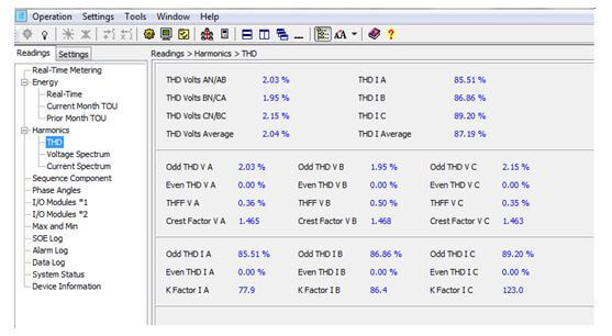 - Click on "THD" to view voltage THD, current THD, crest factor, K factor etc.