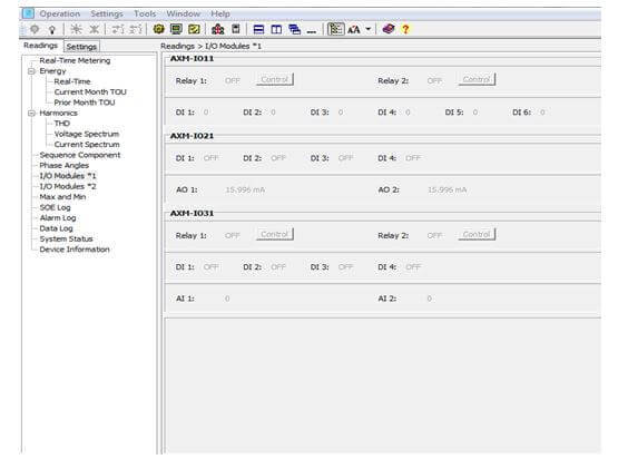 - From the left navigation panel click on the "Readings" tab, and then click on "I/O Modules *1" or "I/O Modules *2" to view the I/O data, such as DI status, pulse counter number, analog input etc.
