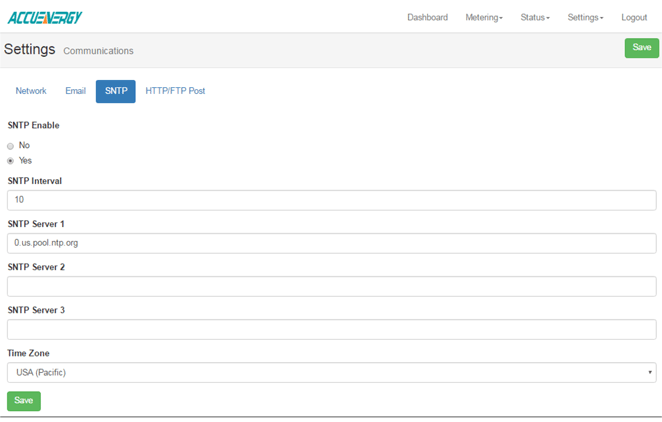 SNTP Interval: Enter a number from 1 min to 6000 min to configure how often the meter will synchronize it's time with the time server.