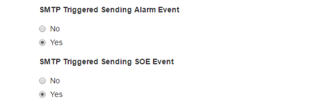 To enable emails to be sent based on a new Alarm or SOE Event, select 'Yes' under "SMTP Triggered Sending Alarm Event" or "SMTP Triggered Sending SOE Event".