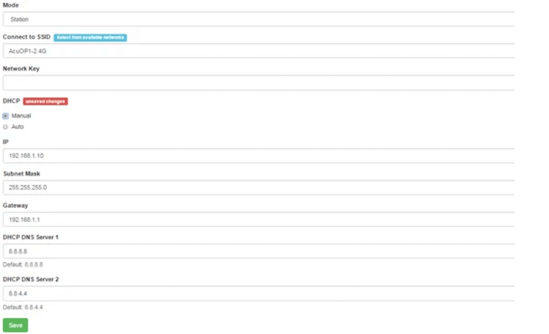 In Access Point mode, users can configure the SSID, Network Key and IP of the AcuRev 2020 module as well as the DNS servers.