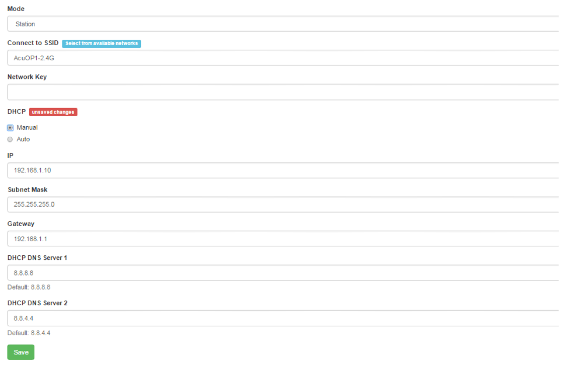 - In Access Point mode, users can configure the SSID, Network Key and IP of the AXM-WIFI module as well as the DNS servers.
