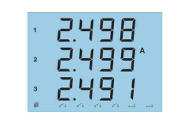- Press ‘V/A’ to display the phase and line voltages, as well as the current readings. The last screen will display the average of the voltage and current.