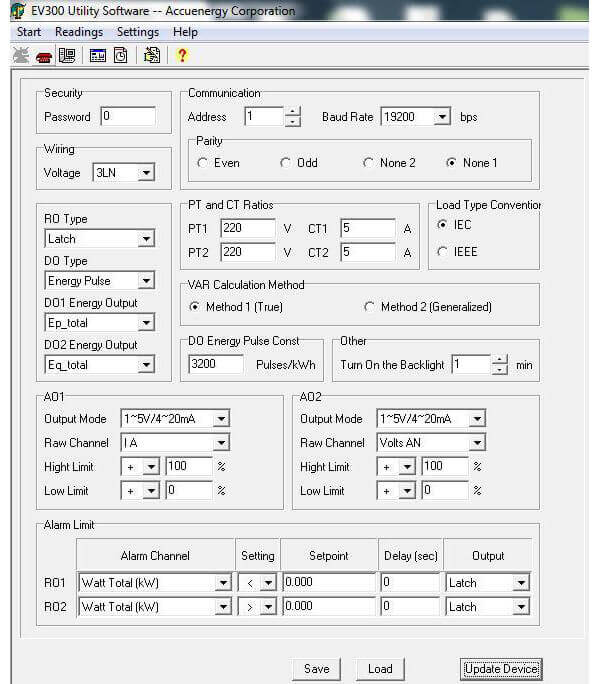icon. You can set up the system parameters and configure the I/O settings from this section. - Click on 'Update Device' after making any changes so that the changes can be saved to the meter.