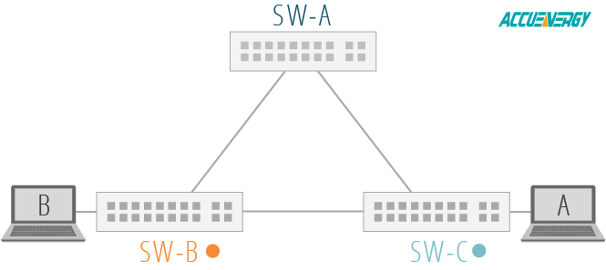 The following illustration shows three switches which are in a loop on the network. When one switch sends out a message, the two other switches on the network receive the message and forward the message to other switches on the network out of all other ports. For example, when Switch B sends a message to Switch A and Switch C, those switches receive the message and rebroadcast it to the other switches. When Switch A and Switch C initiate broadcasts across the network as well, the network can become congested with repeated broadcast messages, taking up bandwidth and slowing down the entire network.