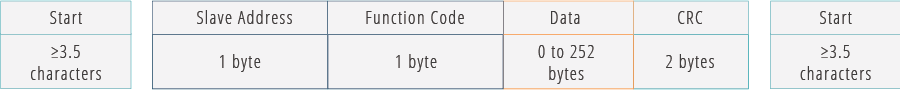 Modbus data packets contain key information for communicating across the network. Each packet contains the same information: Slave Address, Function Code, Data, and Cyclical Redundancy Checking (CRC). The CRC, or error checking, is especially important to ensure that the contents of the message are valid. The maximum size of each packet is 256 bytes and between each packet is a silent interval (length: 3.5 characters) that indicates to a device that the message is complete.